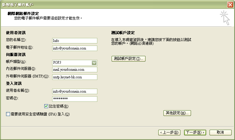 8. 如果你的網絡供應商(ISP)提供的SMTP不需要驗證,可直接按"下一步”即可完成設定。